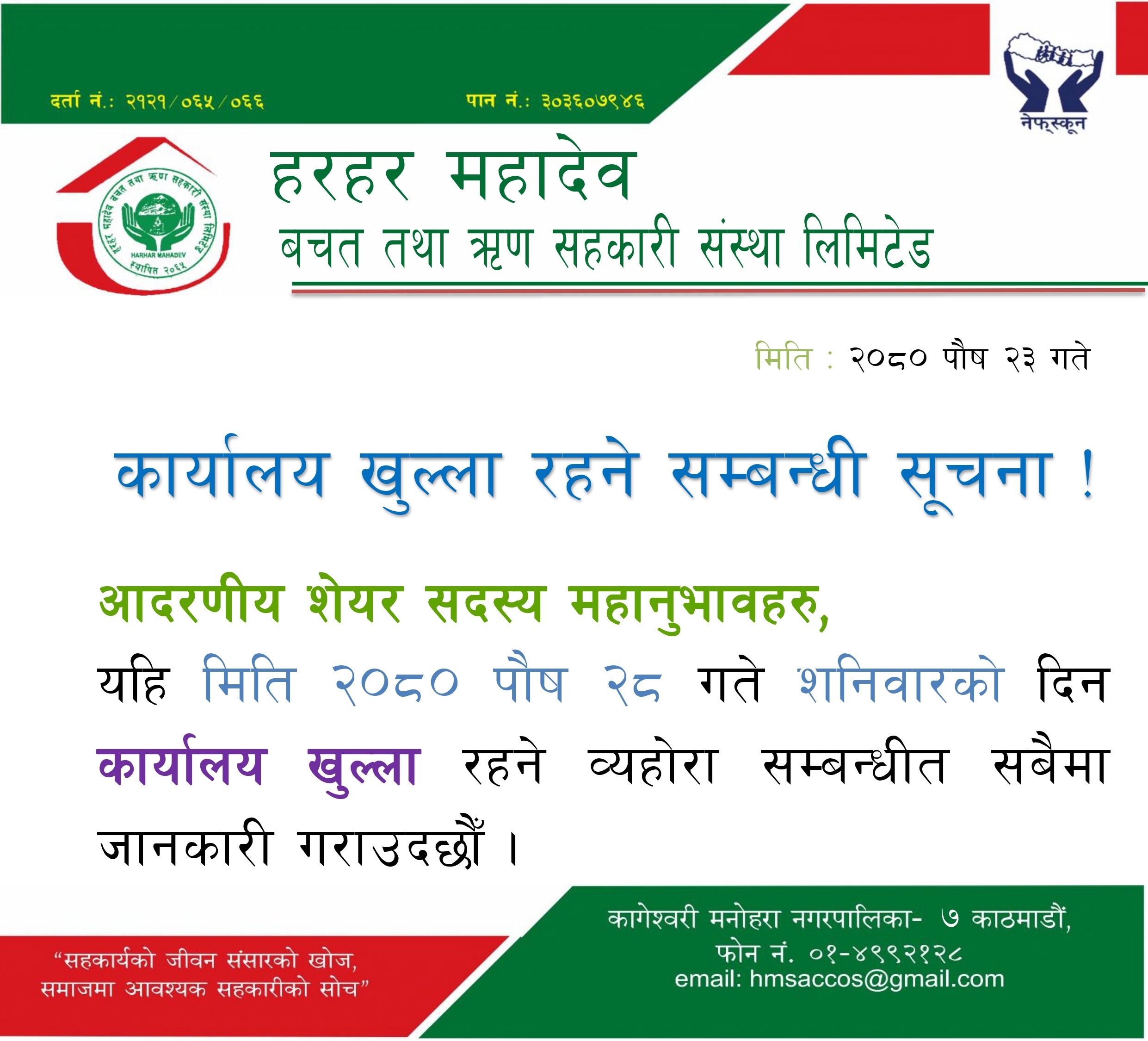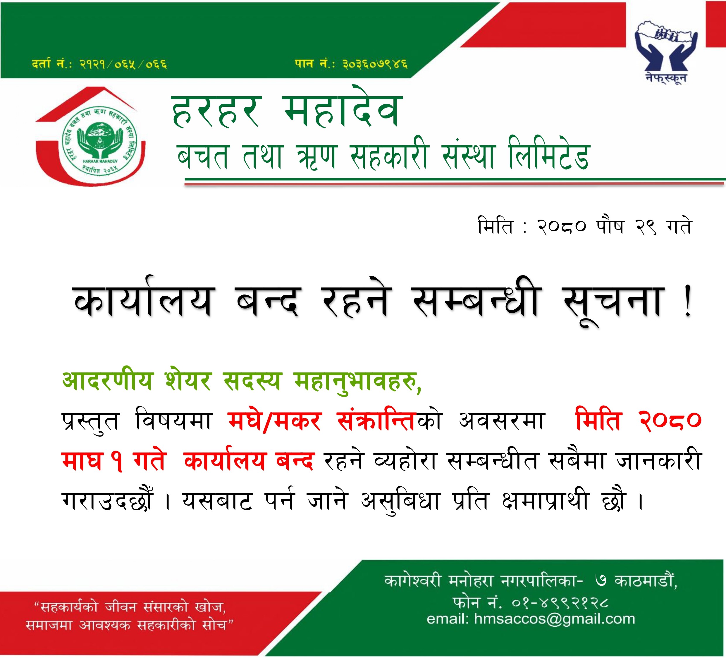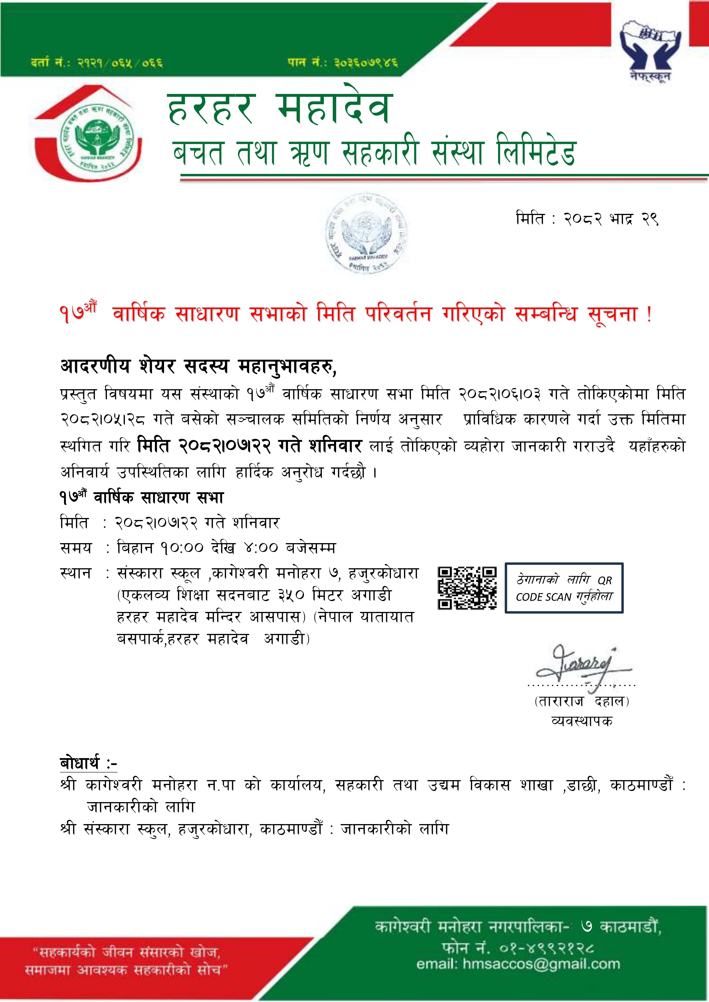 हरहर महादेव सहकारी संस्था लिमिटेड काठमान्डौं जिल्लाको उत्तर पुर्वमा रहेको कागेश्वरी मनोहरा नगरपालिका ( साविक गोठाटार गा.वि.स.), वडा नं. ७ मा अवस्थित छ । विक्रम संम्वत २०५८ देखि २०६० साल तिरमा द्धन्द्धकालको कारणले गर्दा गाउँ तथा विकट क्षेत्रका विकासप्रमी, समाजसेवी, शिक्षक, राजनैतिक छत्रछायामा रहेका व्यक्तिहरुले आफ्नो तथा परिवारको जिवन रक्षाको लागि गाउँबाट बिस्तापित हुनुपर्ने बाध्यता थियो । ज्यान जोगाउन कै लागि भए पनि आफ्नो थत्थलो छाडेर शहरतिर विस्तापित हुनुपर्ने अवस्था सृजना भएको थियो । शहरको न...