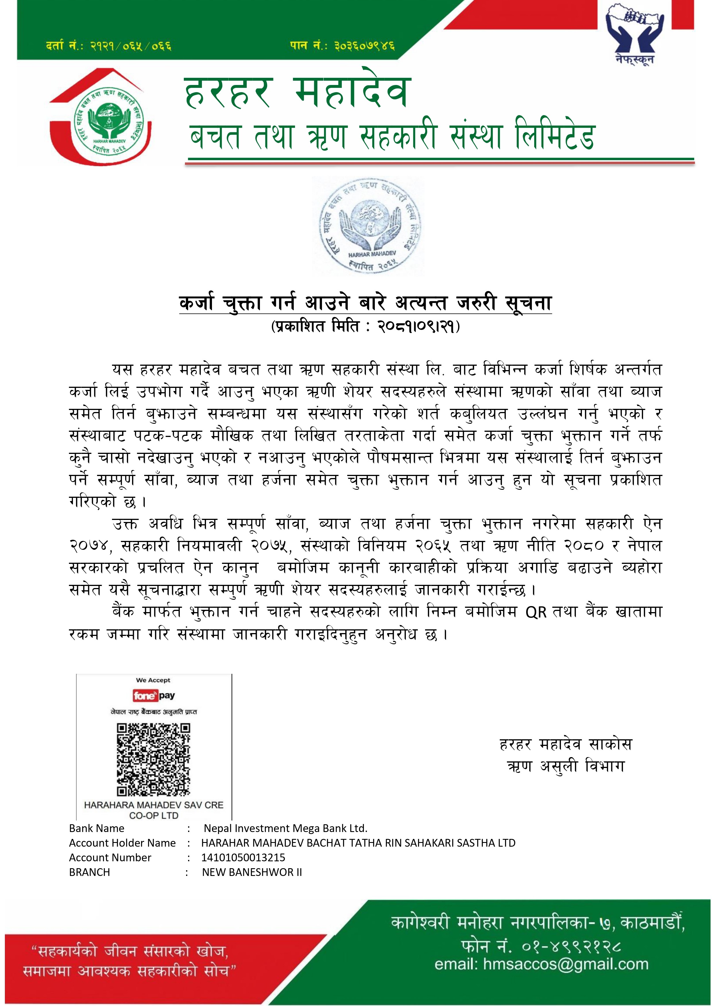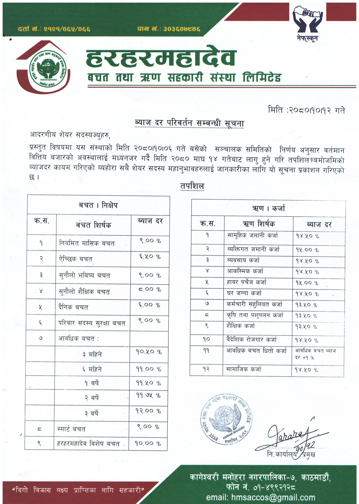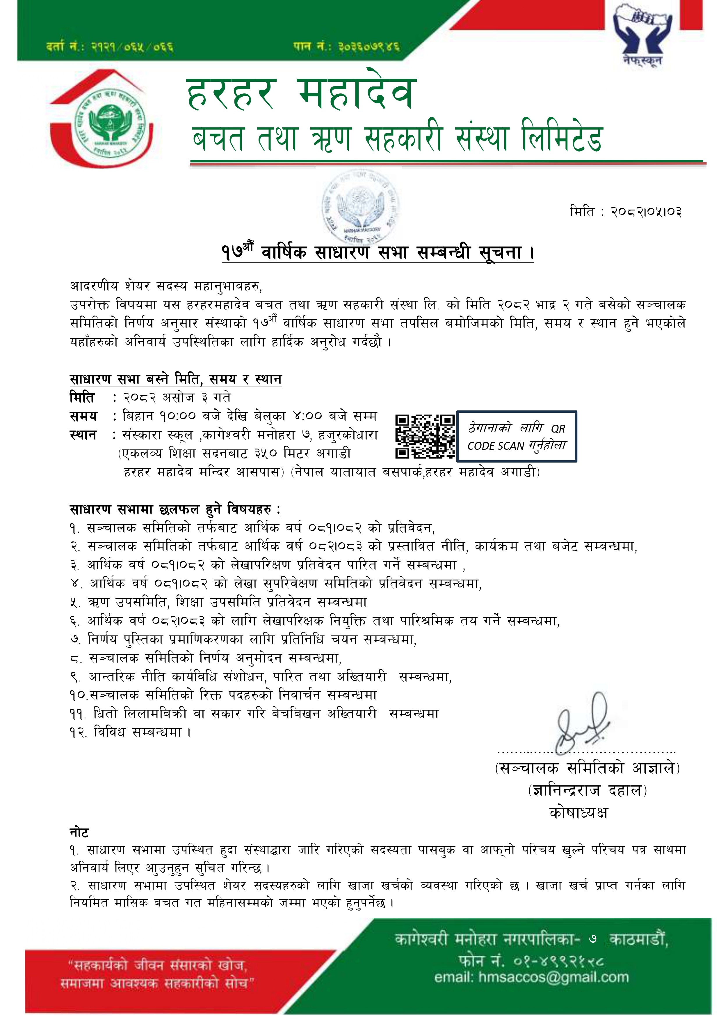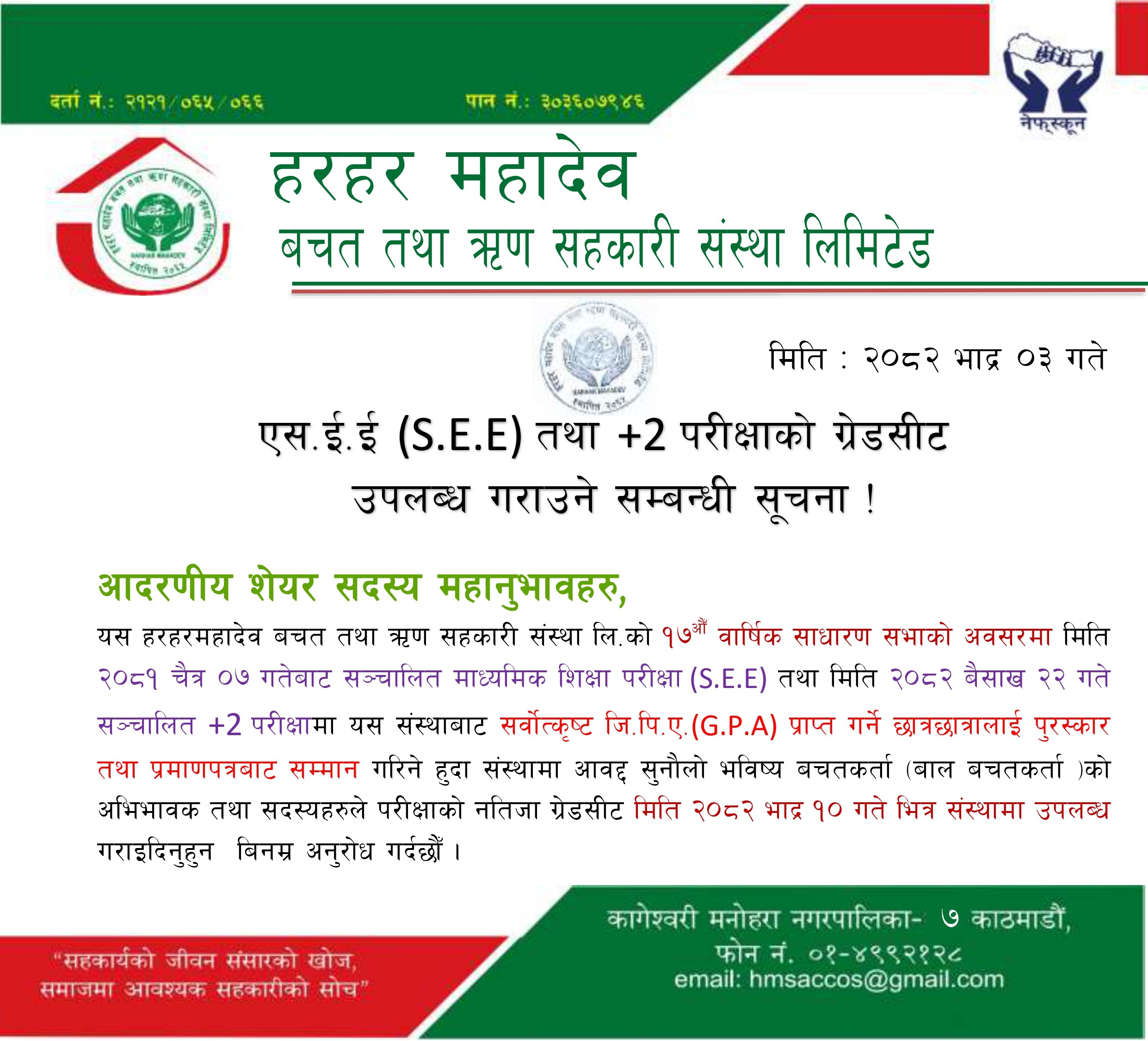 हरहर महादेव सहकारी संस्था लिमिटेड काठमान्डौं जिल्लाको उत्तर पुर्वमा रहेको कागेश्वरी मनोहरा नगरपालिका ( साविक गोठाटार गा.वि.स.), वडा नं. ७ मा अवस्थित छ । विक्रम संम्वत २०५८ देखि २०६० साल तिरमा द्धन्द्धकालको कारणले गर्दा गाउँ तथा विकट क्षेत्रका विकासप्रमी, समाजसेवी, शिक्षक, राजनैतिक छत्रछायामा रहेका व्यक्तिहरुले आफ्नो तथा परिवारको जिवन रक्षाको लागि गाउँबाट बिस्तापित हुनुपर्ने बाध्यता थियो । ज्यान जोगाउन कै लागि भए पनि आफ्नो थत्थलो छाडेर शहरतिर विस्तापित हुनुपर्ने अवस्था सृजना भएको थियो । शहरको न...